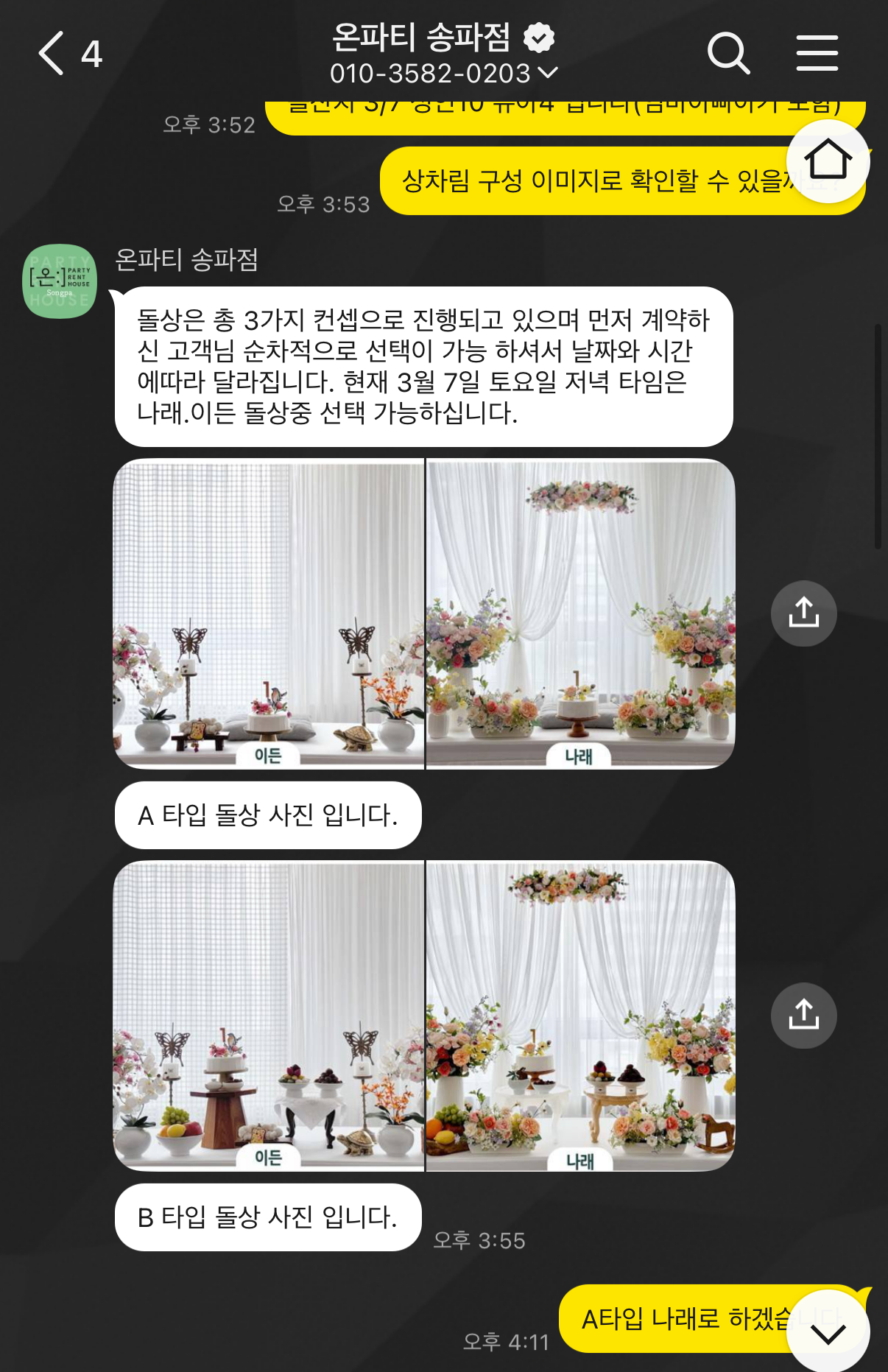 온파티는 돌상 컨셉을 몇 가지 중에서 고를 수 있고, 실제 후기 사진을 봐도 촌스럽지 않고 깔끔한 스타일이라 마음에 들었어요. 원하는 분위기에 맞춰 선택할 수 있는 점이 좋았습니다.